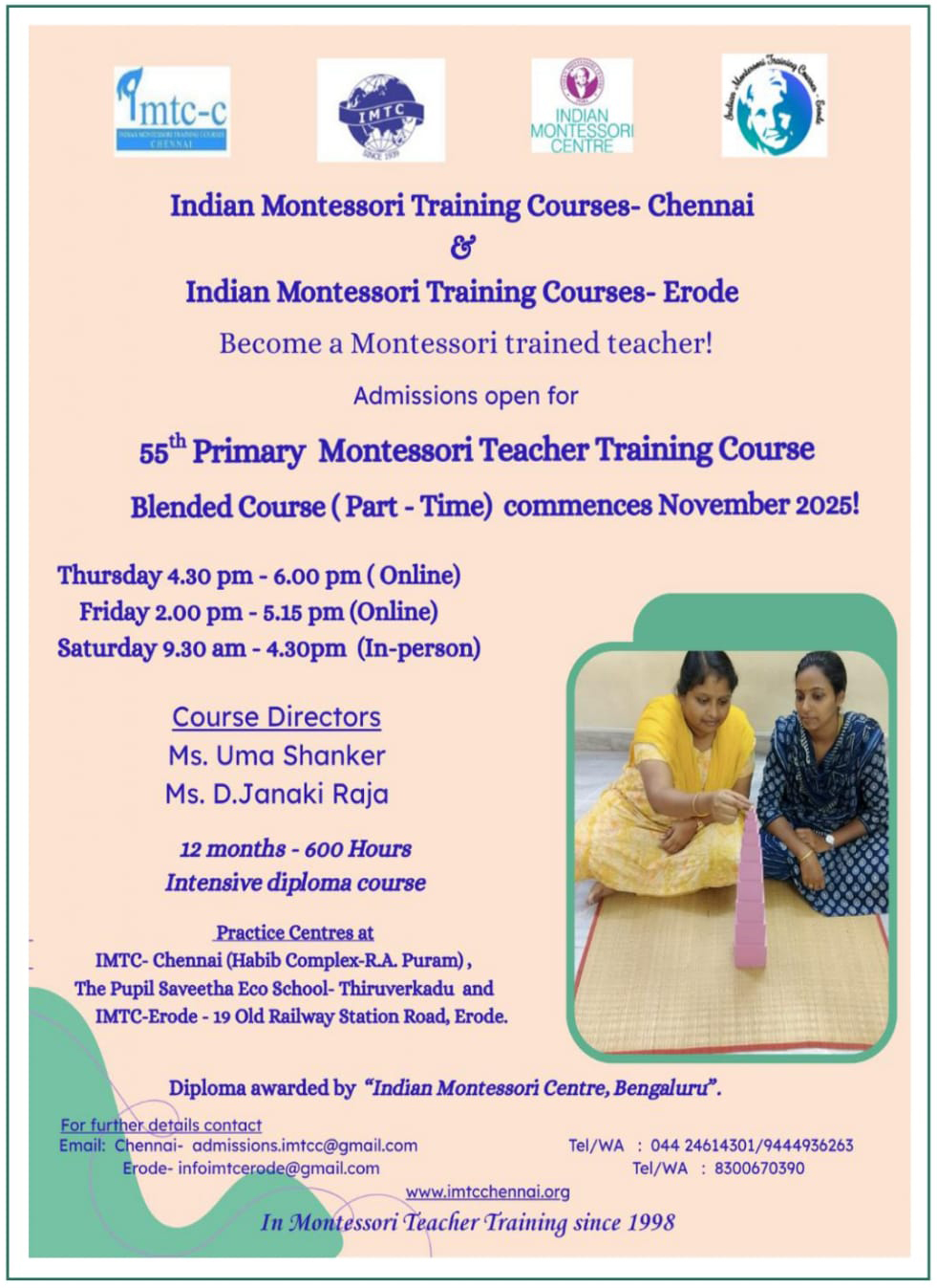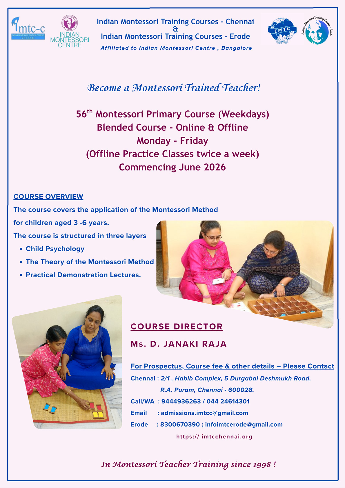 The Primary Montessori Diploma qualifies the holder to apply the Montessori method of education to children between the age of 3 years and 6 years.